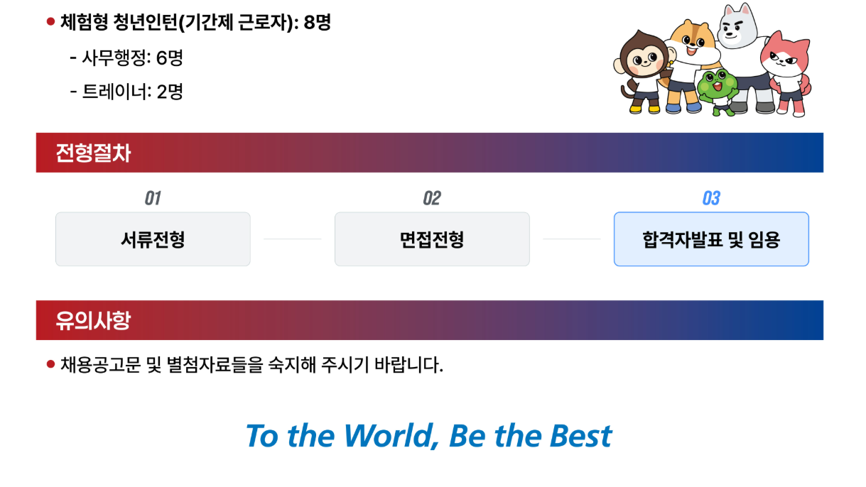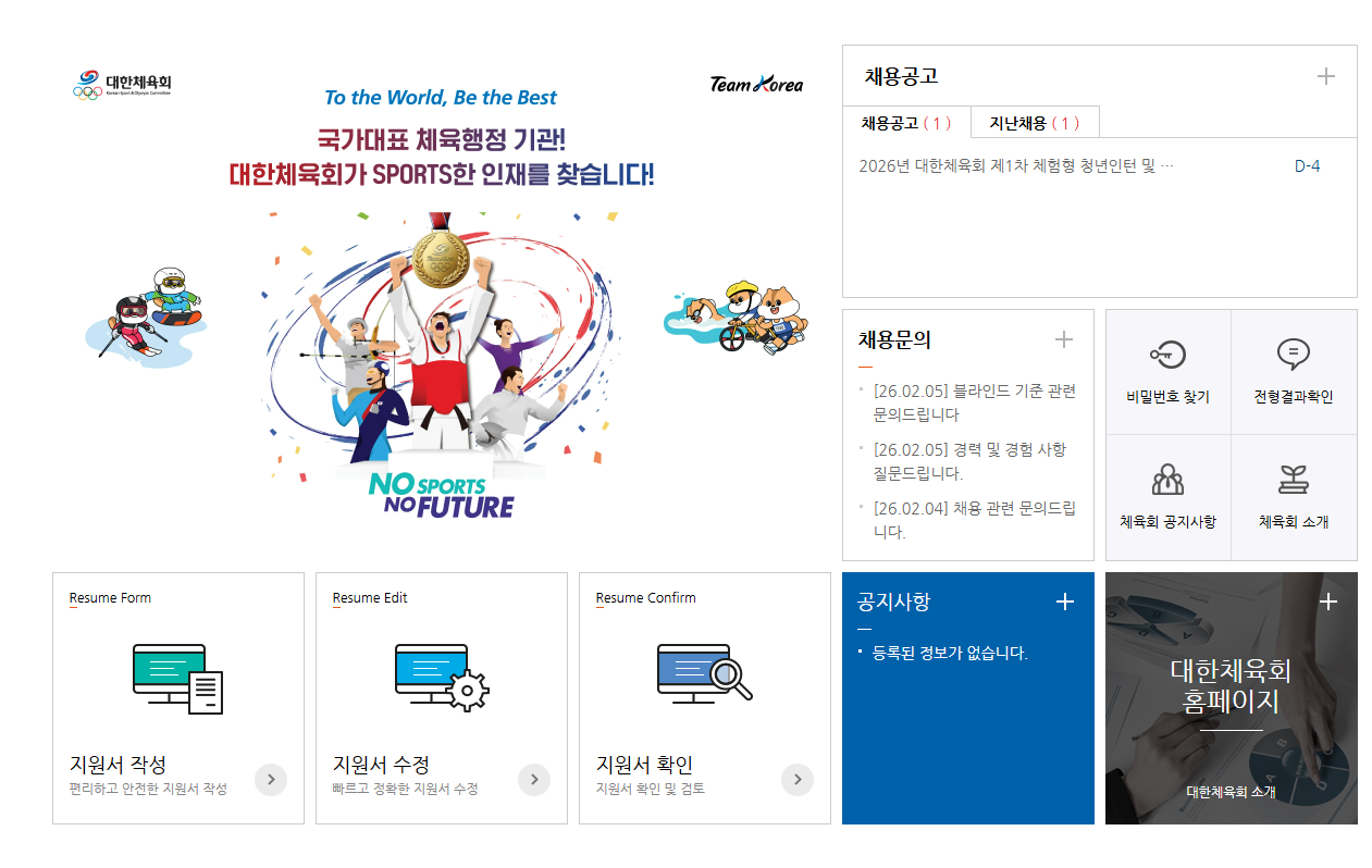 2026년 제1회 대한체육회(KSOC)에서는 '책임 있는 변화로 다시 뛰는 대한체육회' 를 함께 구현할 우수한 인재를 공개 채용합니다. Team Korea의 일원이 되서 함꼐 일할 분들의 많은 지원 바랍니다.