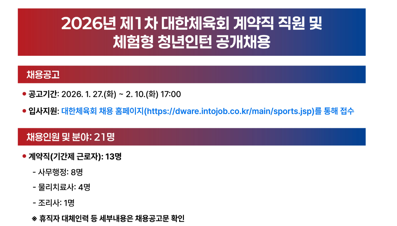 2026년 제1회 대한체육회(KSOC)에서는 '책임 있는 변화로 다시 뛰는 대한체육회' 를 함께 구현할 우수한 인재를 공개 채용합니다. Team Korea의 일원이 되서 함꼐 일할 분들의 많은 지원 바랍니다.