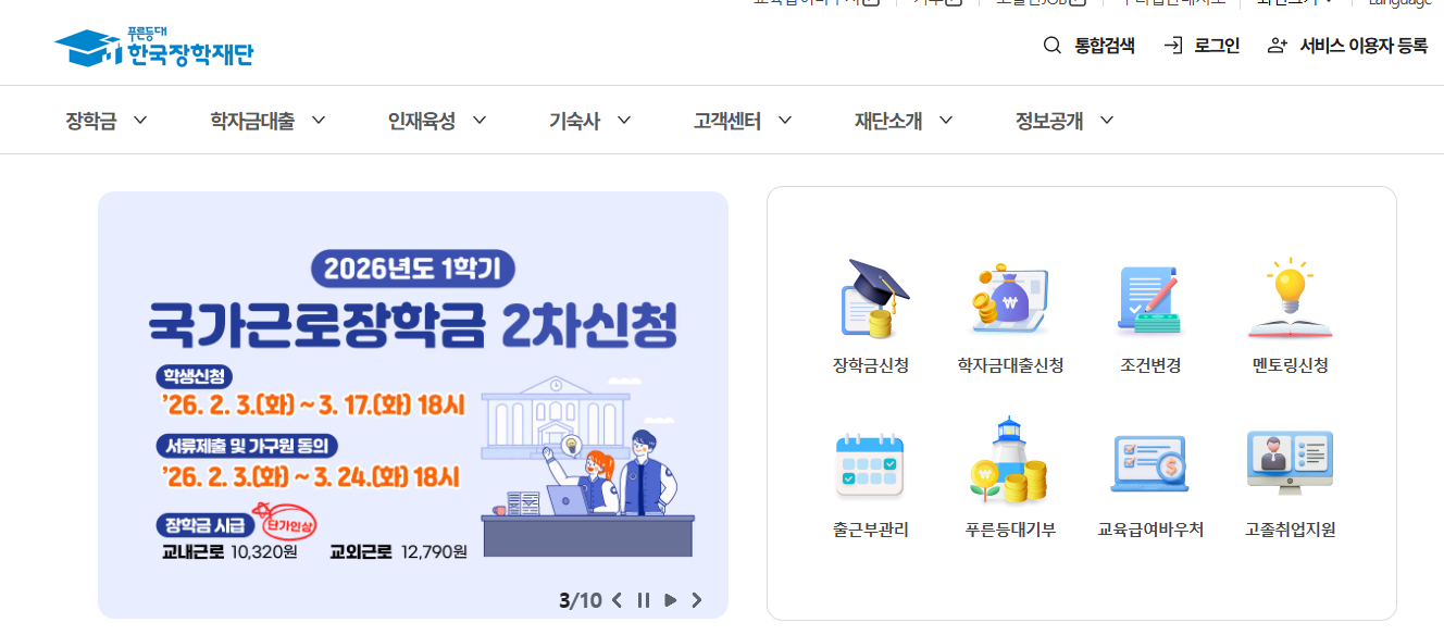 온라인 하국장학재단 PC 나 모바일 앱 로그인후 확인하고 신청합니다.