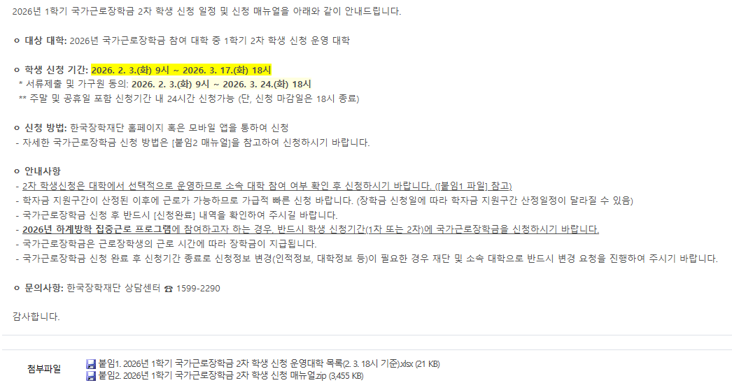 이번 2026년 국가장학금 개편은 ‘지원 규모 확대’와 ‘형평성 개선’이라는 두 가지 방향을 동시에 담고 있습니다. 개인별 수혜 한도 개선, 우수장학금 확대, 근로장학금 단가 현실화 등은 학생들의 실질적인 체감도를 높이는 변화로 평가됩니다. 대학 등록금과 생활비 부담이 커지는 상황에서 국가장학금은 선택이 아닌 필수가 되고 있습니다. 신청 일정과 소득 구간 기준을 미리 확인해 놓는 것이 무엇보다 중요합니다.