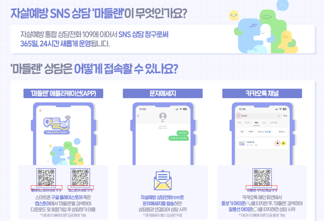 자살예방상담은 109로 모두 통합되었으며, 정신건강상담전화(1577-0199), 청소년전화(1388), 여성긴급전화(1366) 등도 가능하여 상시 운영 중입니다. 통화도 가능하지만 카카오, DM이 익숙한 세대인 만큼 온라인 채팅으로 언제든 스마트폰만 있으면 상담 가능합니다. 구글, 애플 스토어에서 마들랜 다운, 카카오 상단 돋보기에서 마들랜 검색후 친구추가 후 상담하기