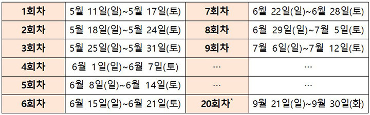 | 회차 | 매주 일요일 ~ 토요일 진행 |