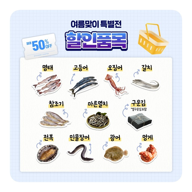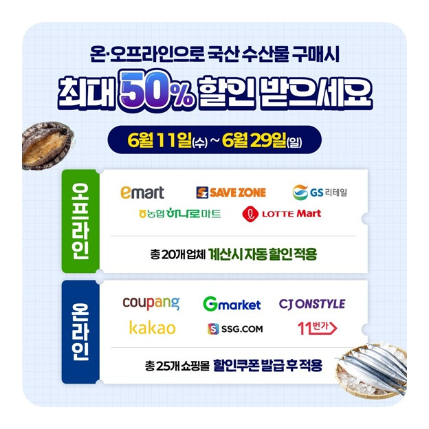 명태, 고등어, 오징어, 갈치, 전복, 광어, 멍게 등 여름철 별미 수산물이 포함되어 있습니다.. 게다가 이마트·세이브존·GS리테일·농협하나로마트·롯데마트 같은 오프라인 유통채널과 쿠팡·G마켓·SSG.COM·11번가 등 온라인몰에서 할인쿠폰을 발급받아 바로 사용할 수 있답니다