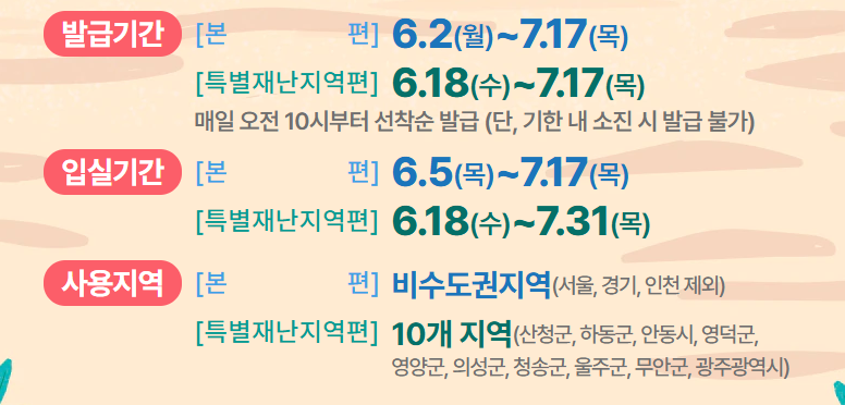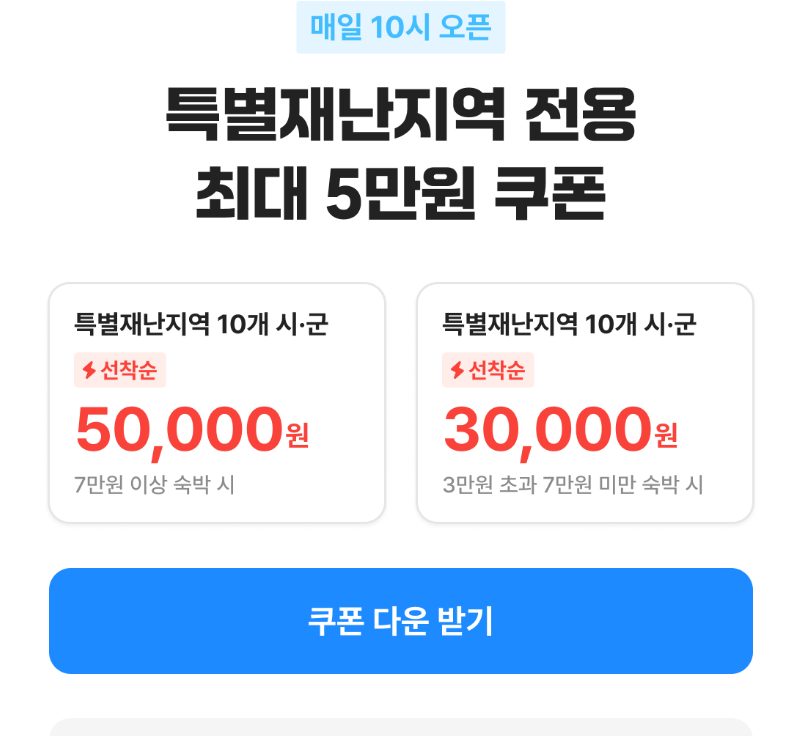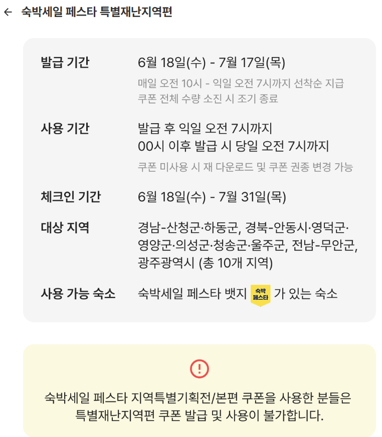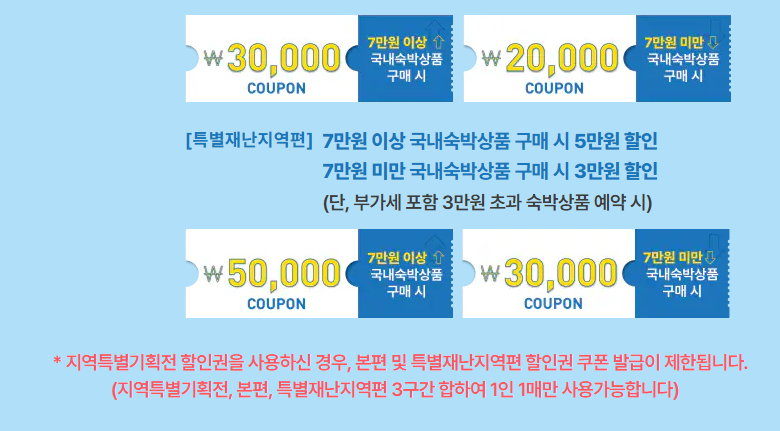 | 특별재난지역(산청·영덕 등) | 전통민박·펜션 | 최대 5만 원 | 지역특화 플랜 사용 가능 |