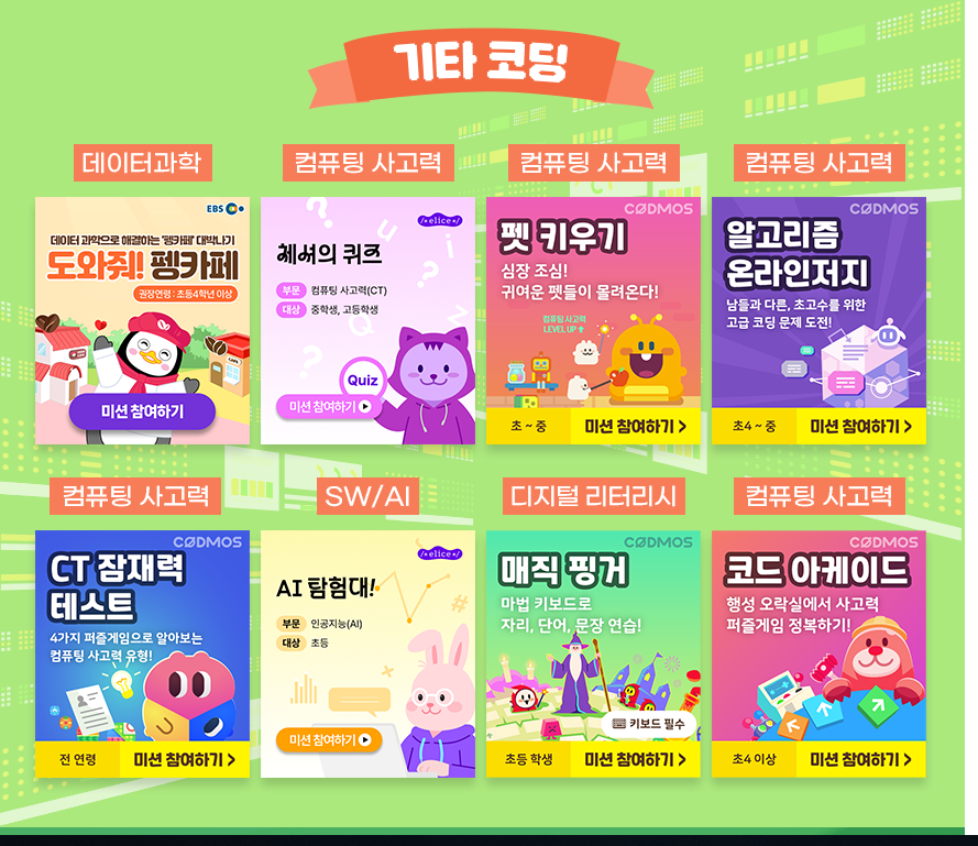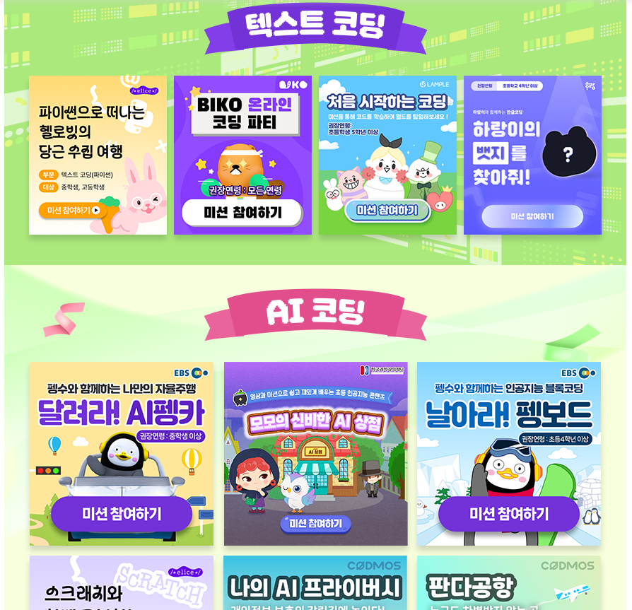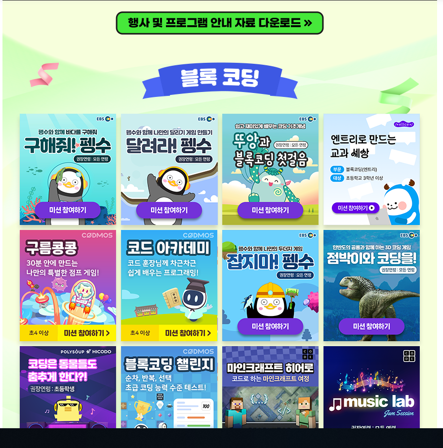 이번 2025 온라인 코딩파티에서는 초등학생부터 일반인까지 모두 만족할 수 있도록 다양한 테마와 단계별 콘텐츠가 준비되어 있다. 주요 예시는 다음과 같다.