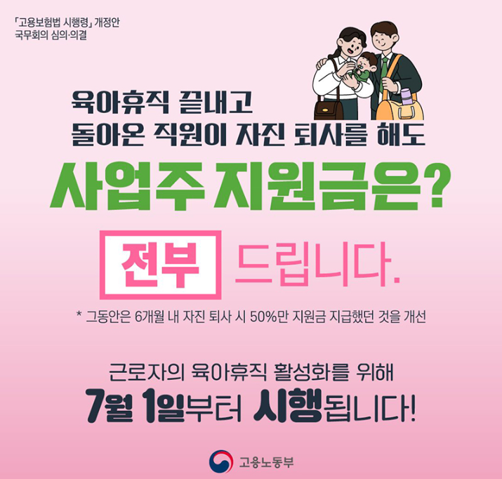 하지만 이 구조적인 문제에 정부가 ‘직접 개입’하겠다는 신호탄을 쐈습니다. 바로 육아휴직 근로자에 대해 사업주에게 주는 지원금을 100% 지급하는 정책이 2025년부터 본격 시행되기 때문입니다. 고용보험법 시행령 개정안이 6월 국무회의를 통과하며, 제도는 이제 현실로 다가왔습니다.