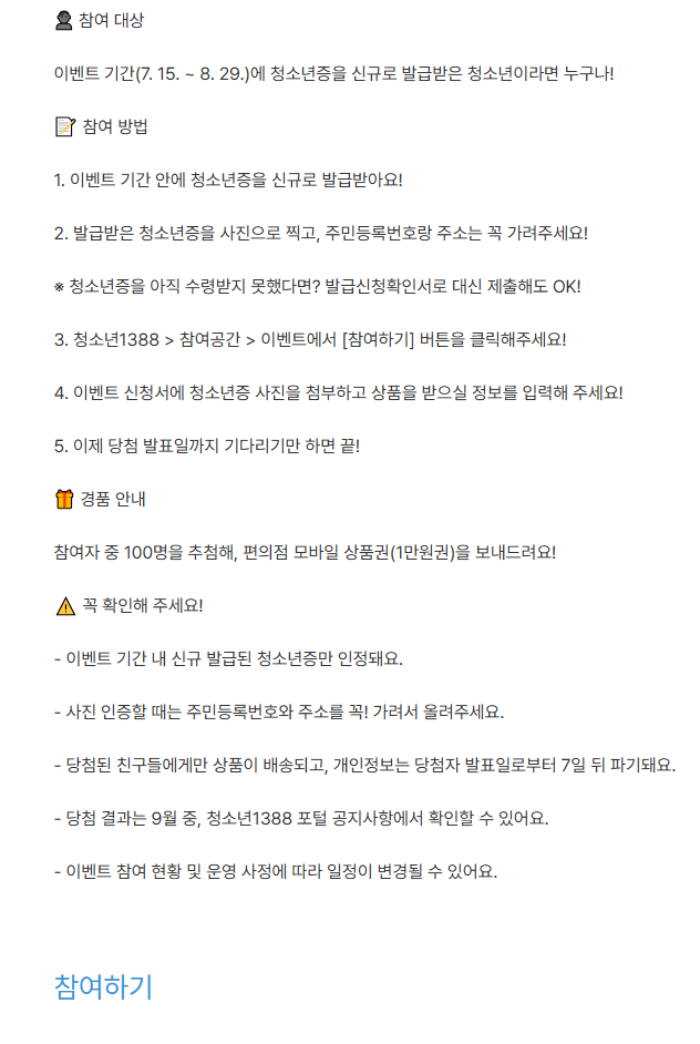 청소년증을 아직 발급받지 않았다면 지금이 기회! 7월 15일부터 8월 27일까지, 상품권 이벤트 기간을 놓치지 말고 지금 바로 신청하세요.