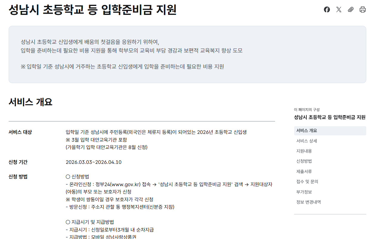 2026년 성남시 초등학교 신입생 입학준비금 지원 신청하기 20만원 (~4/10일)