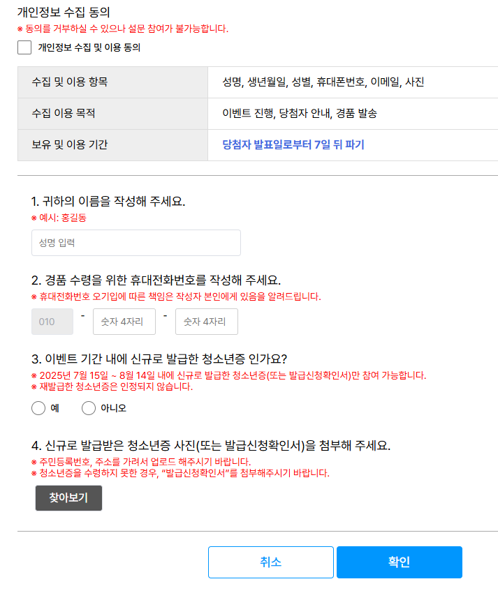 - 행사 기간 내 신규 청소년증 발급 및 본인 인증 완료자